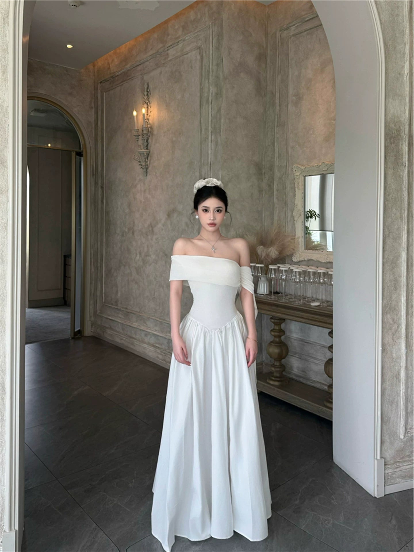 French Style Off Shoulder High Waist Slimming A-Line Maxi Dress