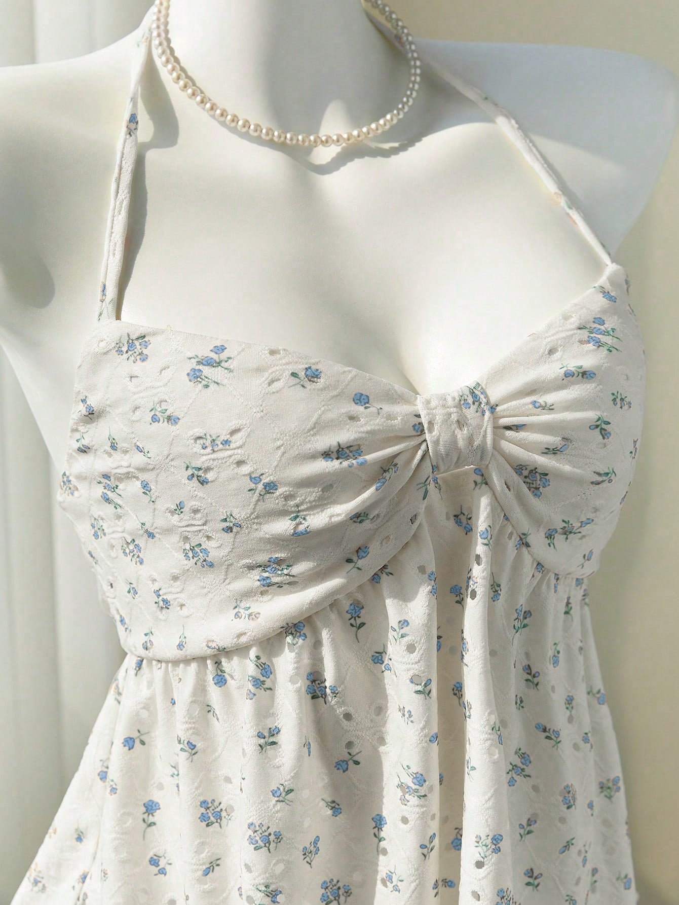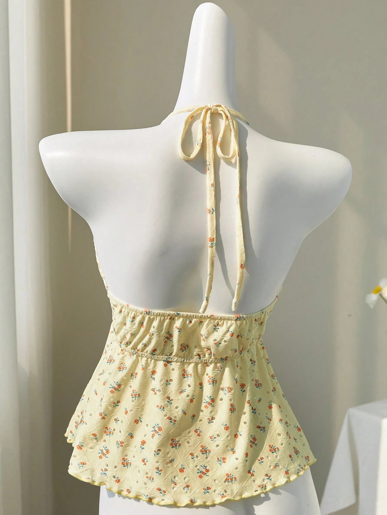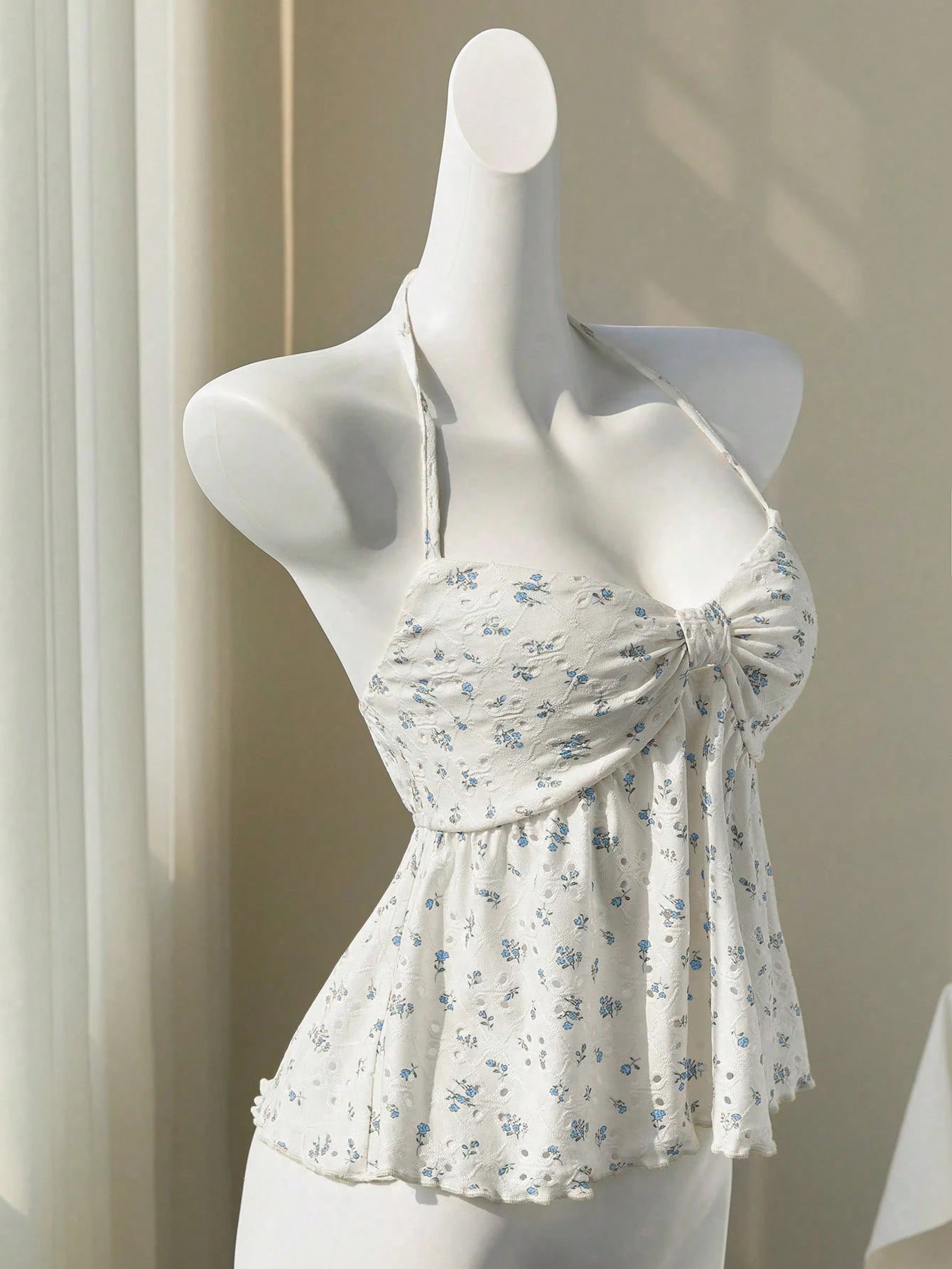 Sweet Floral Tie-Strap Vest Top with Built-In Cups Slim Fit Sleeveless Style
