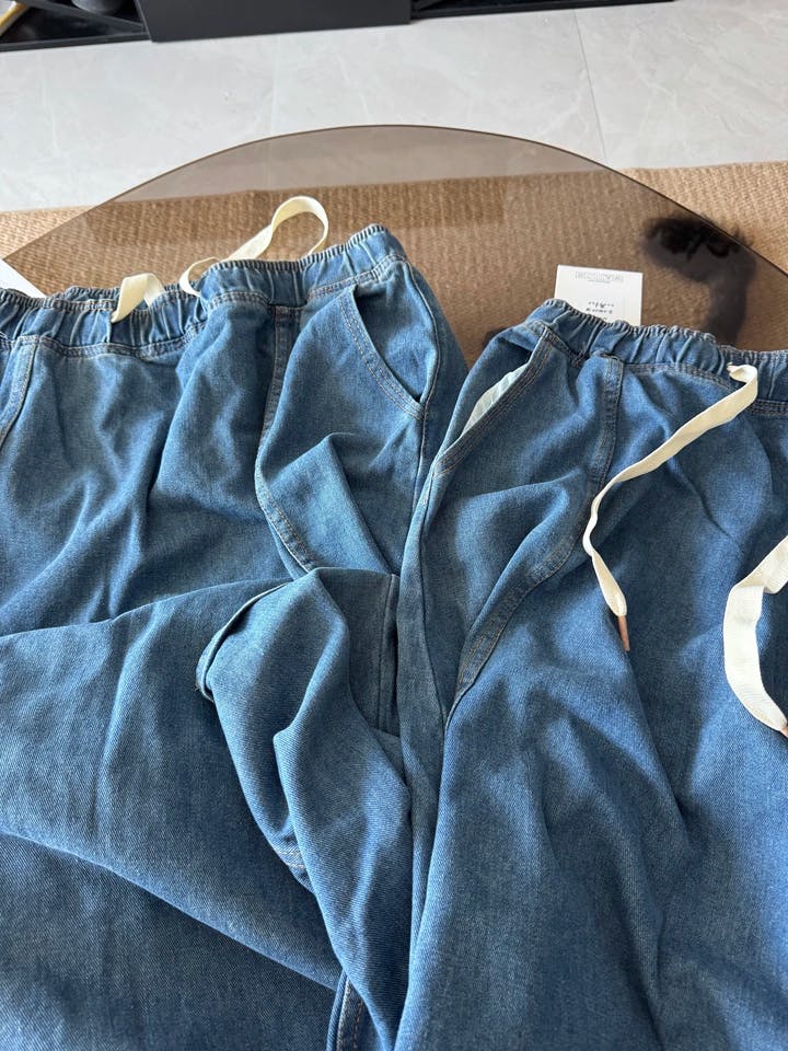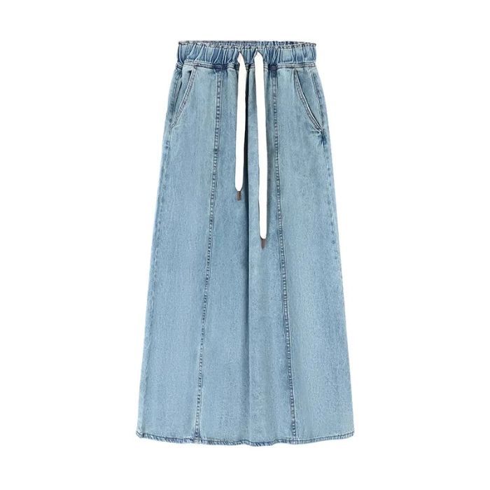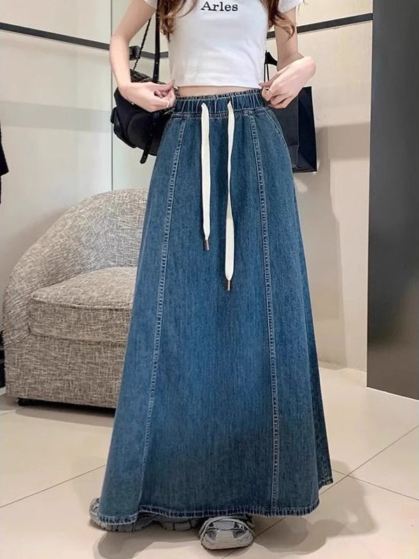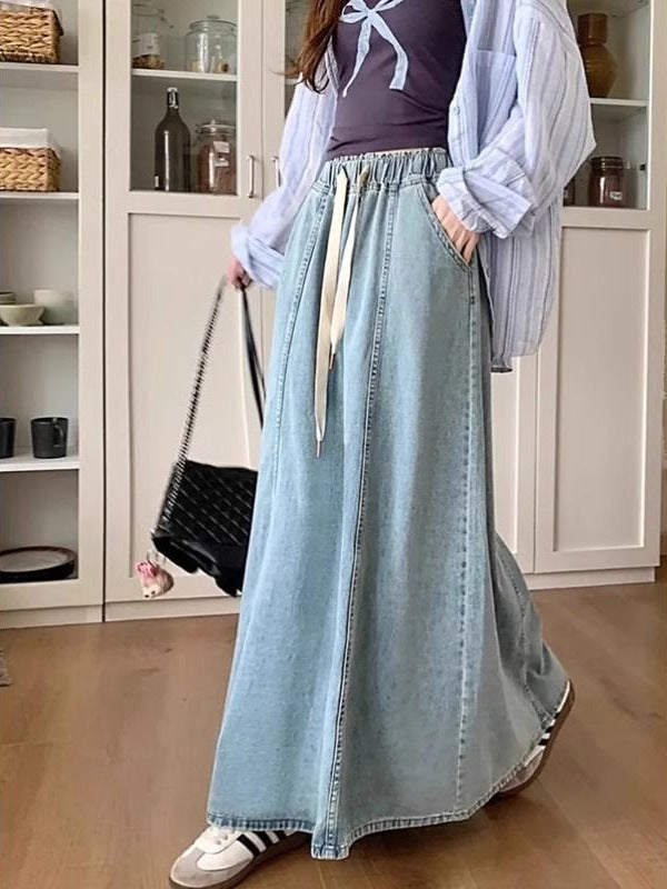 Retro A-Line Long Denim Skirt with Elastic Waist and Pockets