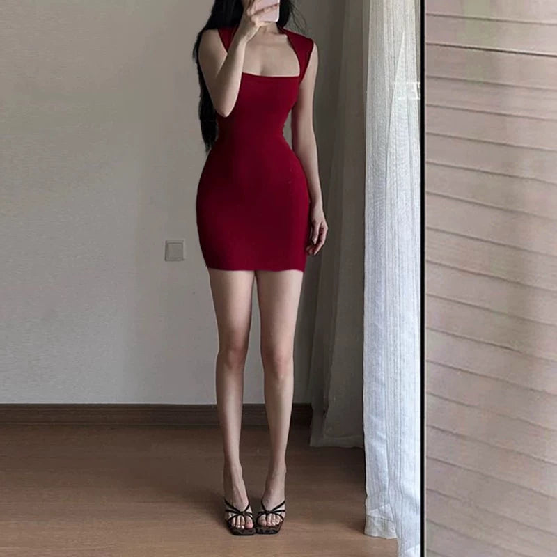 Sexy Square Neck Silk Wool Blend Hip-Hugging Summer Mini Dress