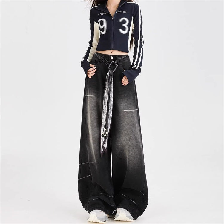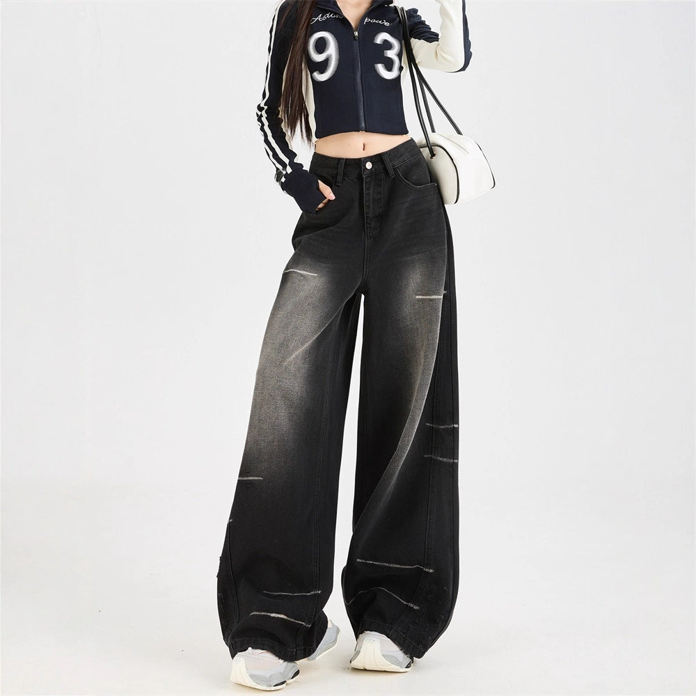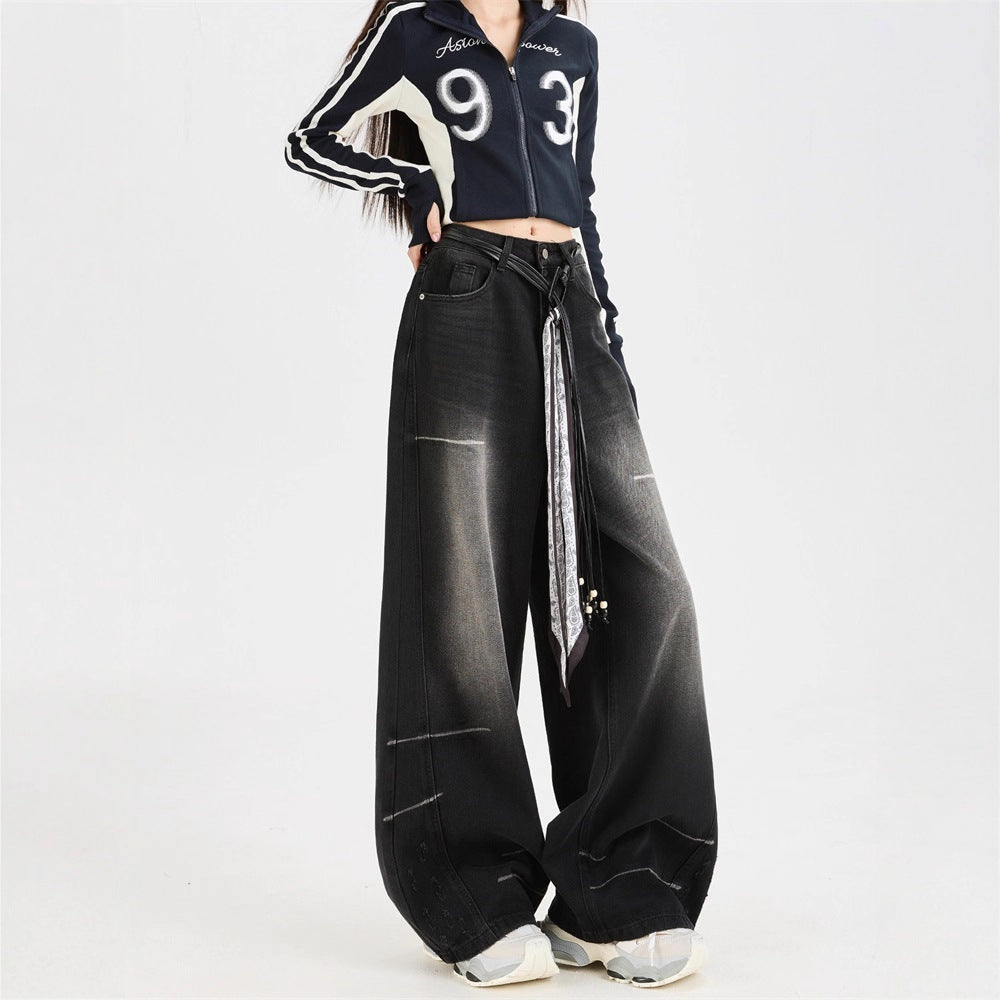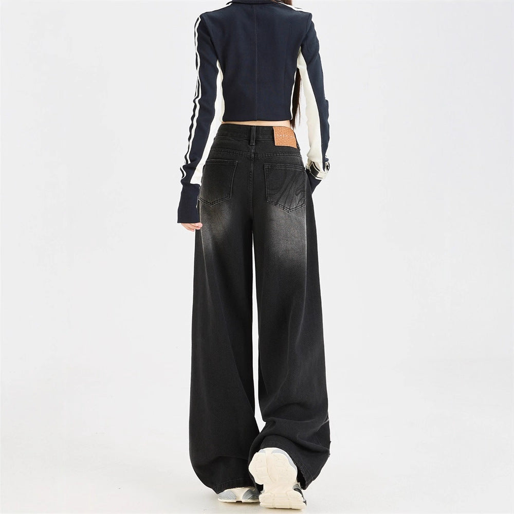 Dark Grey Wide Leg Denim Jeans Loose Straight Fit Casual Streetwear Style